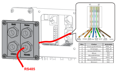 Op onderstaand schema zie je hoe de aansluitingen moeten gebeuren. Signaal goodwe RJ45: 1 wit/oranje → A en 2 oranje → B.