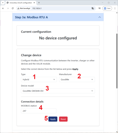 In de Jullix of Extender moet de omvormer communicatie nog geconfigureerd worden. Wanneer je een Goodwe hybride omvormer gebruikt, dan kies je in de modbus RTU configuratie bij Type: Hybrid (1) in de Manufacturer kies je Goodwe (2). Bij Device Model (3) kies je het juiste model, bijvoorbeeld GoodWe GW3648-EM voor een eenfase omvormer van 3,6kW vermogen.