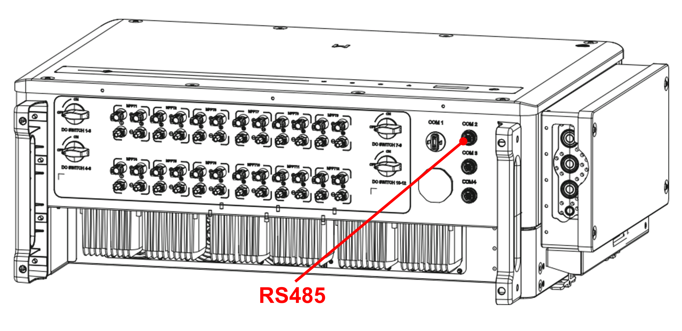 De Jullix of Extender wordt verbonden met de Goodwe HT 1100V via modbus/RS485 van de omvormer. Je vindt de modbus aansluiting terug op de COM 2 poort.