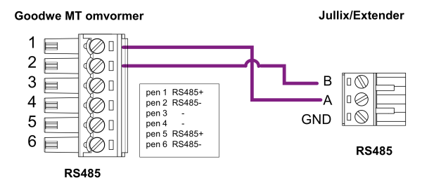 De Jullix of Extender wordt verbonden met de Goodwe MT via modbus/RS485 van de omvormer. Je vindt de modbus aansluiting terug op de RS485 poort.