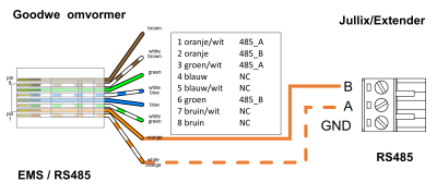 Op onderstaand schema zie je hoe de aansluitingen moeten gebeuren. Signaal goodwe RJ45: 1 wit/oranje → A en 2 oranje → B.