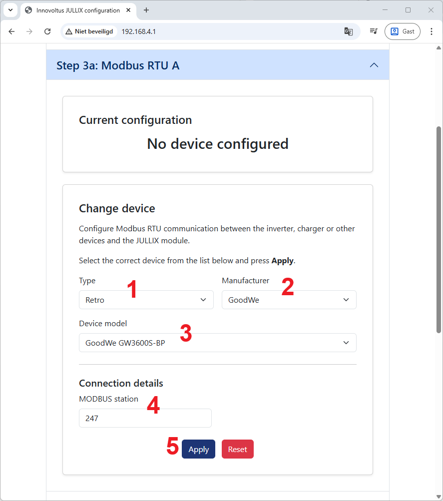 In de Jullix of Extender moet de omvormer communicatie nog geconfigureerd worden. Wanneer je een Goodwe retro omvormer gebruikt, dan kies je in de modbus RTU configuratie bij Type: Retro (1) in de Manufacturer kies je Goodwe (2). Bij Device Model (3) kies je het juiste model, bijvoorbeeld GoodWe GW3600S-BP voor een eenfase omvormer van 3,5kW vermogen.