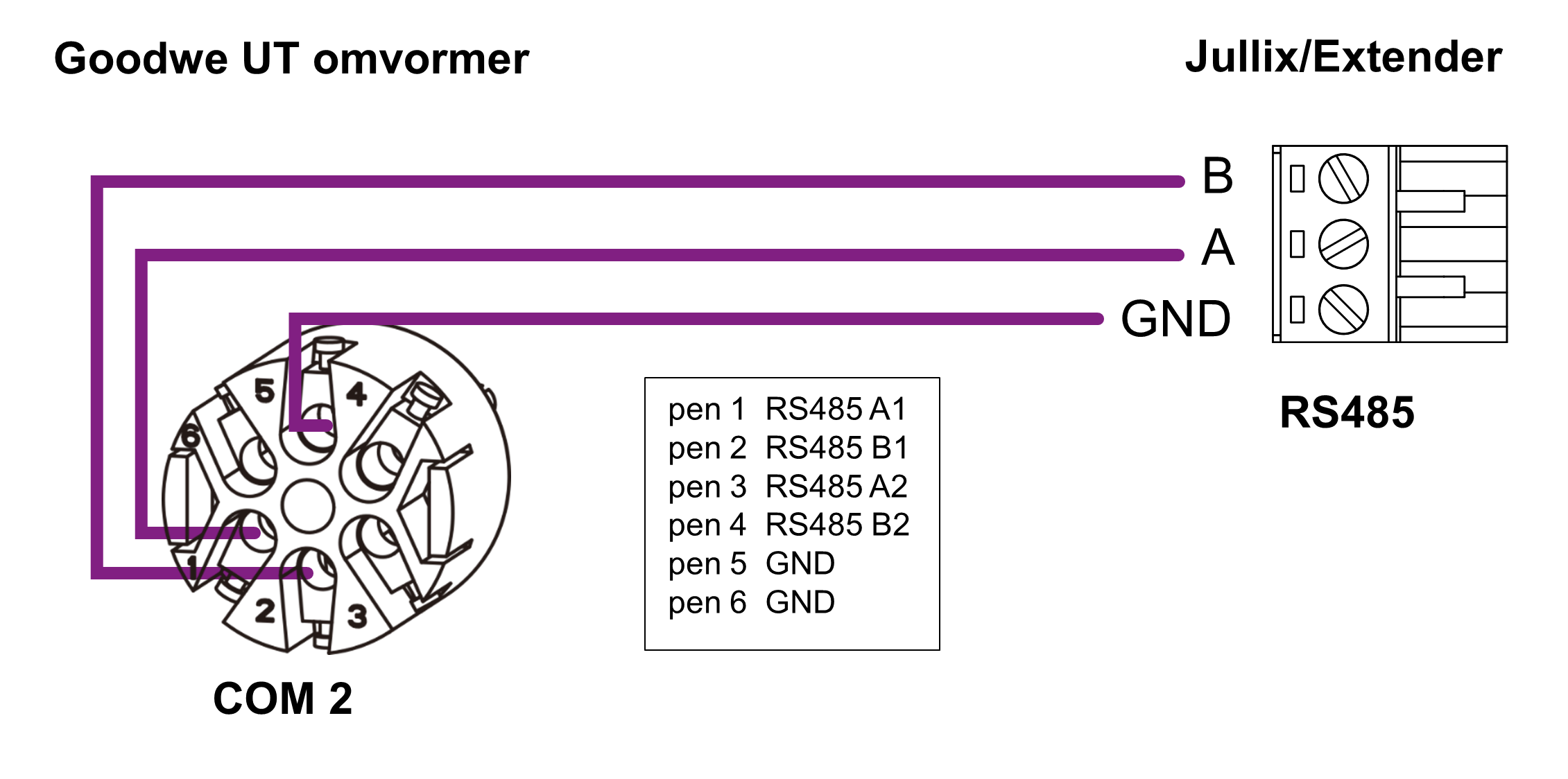 De Jullix of Extender wordt verbonden met de Goodwe UT via modbus/RS485 van de omvormer. Je vindt de modbus aansluiting terug op de COM 2 poort.