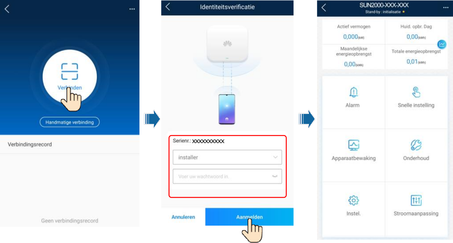 - login als installateur met het wachtwoord gegeven door de klant. Het standaard wachtwoord is “Changeme”, als het wachtwoord niet gekend is, raadpleeg dan de HUAWEI-handleiding om het wachtwoord te resetten.