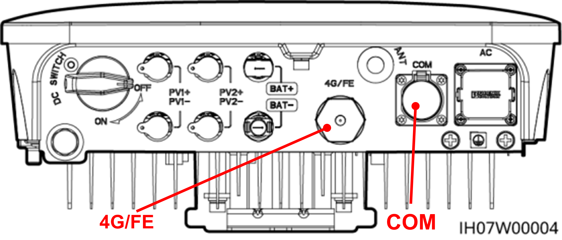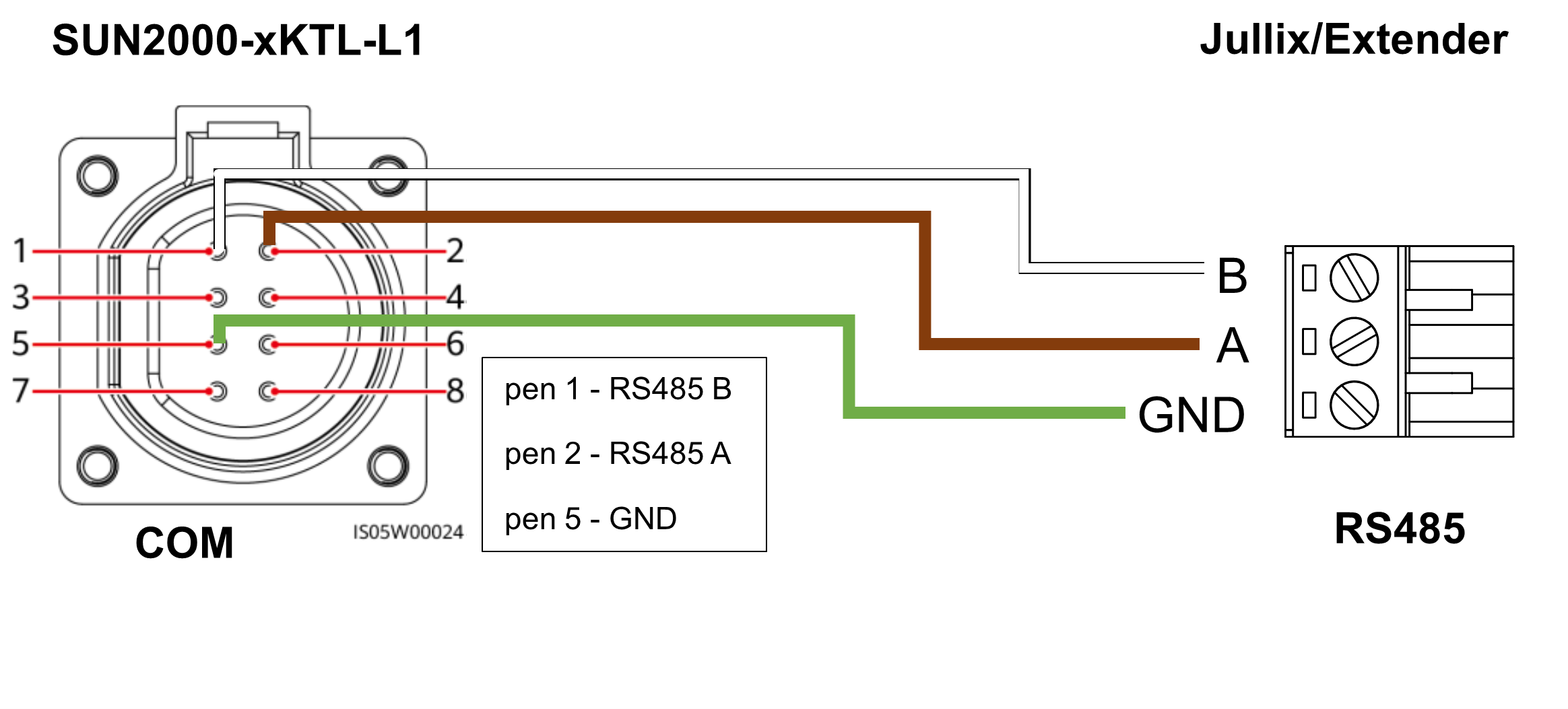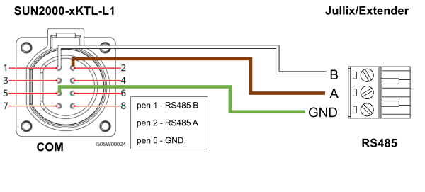 De Jullix of Extender wordt verbonden met de SUN2000-xKTL-L1 via modbus/RS485 van de omvormer. Je vindt de RS485-aansluiting terug op de SUN2000-xKTL-L1 in de COM poort.