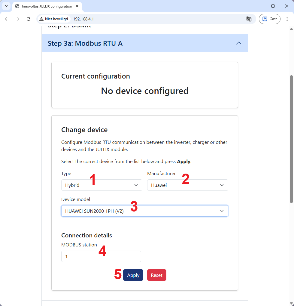 In de Jullix of Extender moet de omvormer communicatie nog geconfigureerd worden. Wanneer je een Huawei SUN2000-xxKTL L1 hybride omvormer gebruikt, dan kies je in de modbus RTU configuratie bij Type: Hybrid (1) en bij Manufacturer kies je Huawei (2). Vervolgens kies je het juiste Device Model, als de omvormer firmware versie V200R001C00SPC146 heeft dan kies je HUAWEI SUN2000 1PH(3), is de firmware V200R001C00SPC151 (nieuwer) dan kies je HUAWEI SUN2000 1PH (V2)(3). In Configure modbus station stel je het juiste modbus adres nog in; meestal is dit 1 (4).
