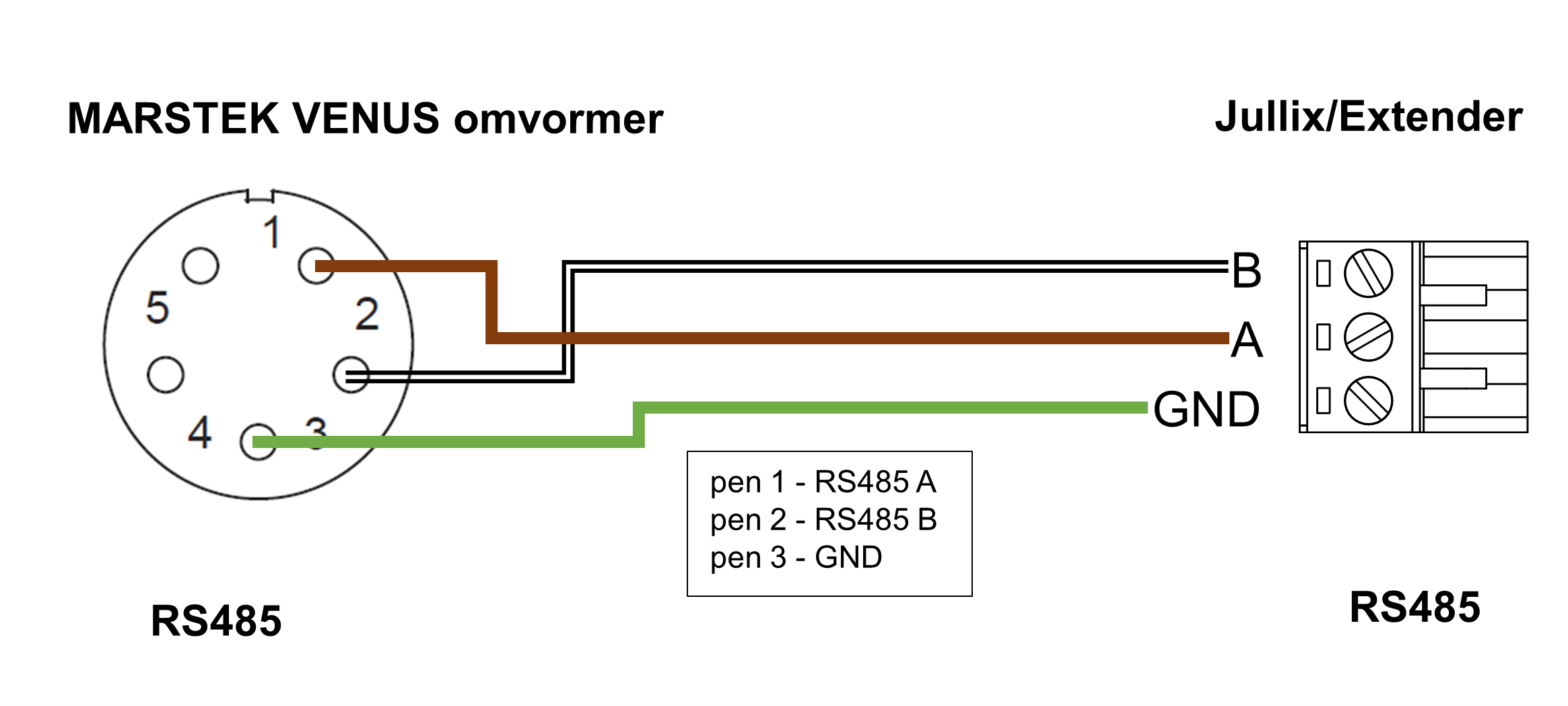Op onderstaand schema zie je hoe de aansluitingen moeten gebeuren. Signaal MARSTEK pen 1 485-A → A, pen 2 485-B → B en pen 3 485-GND → G.