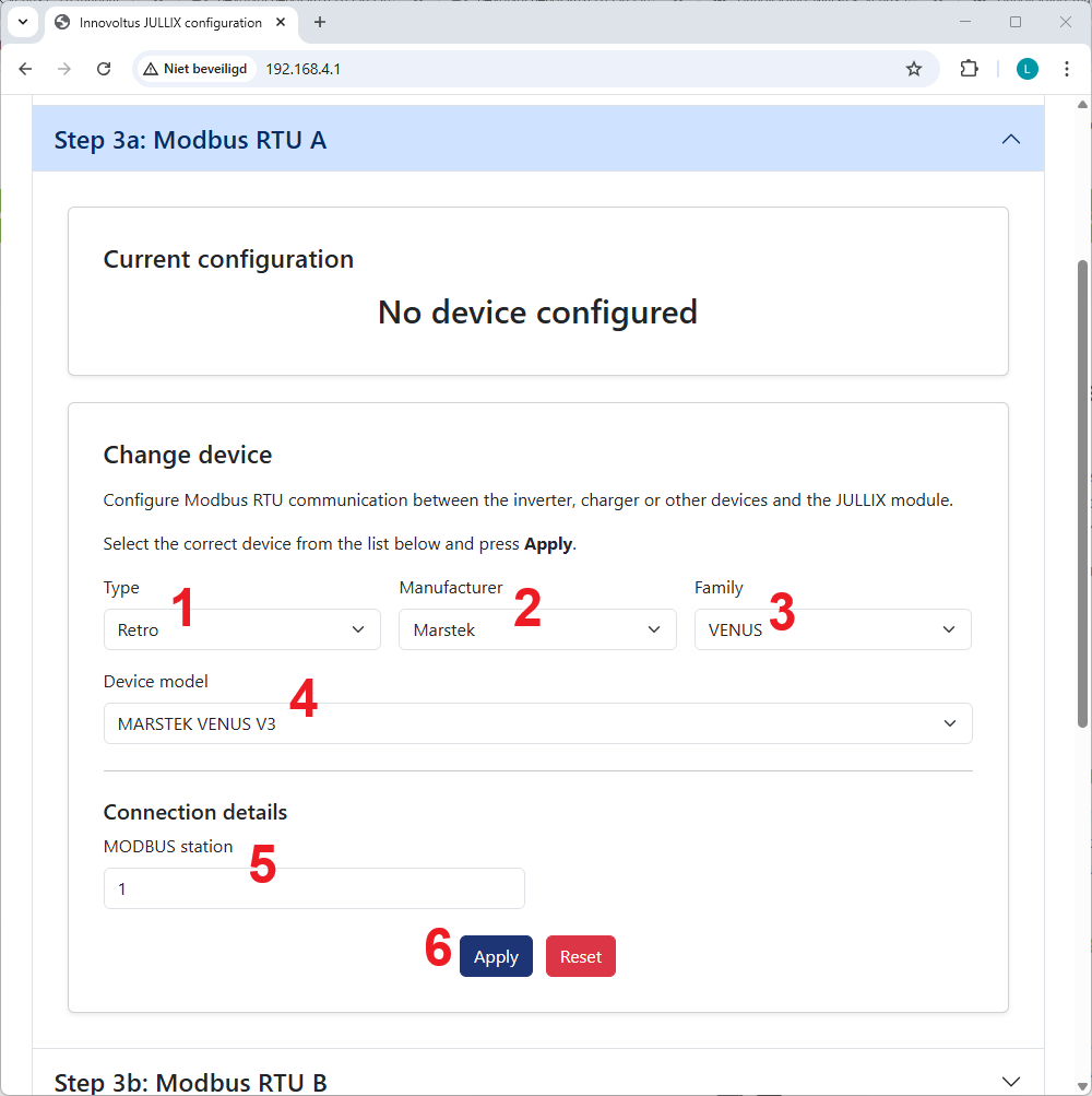 In de Jullix of Extender moet de omvormer communicatie nog geconfigureerd worden. Wanneer je een MARSTEK batterij omvormer gebruikt, dan kies je in de modbus RTU configuratie bij Type: Retro (1) in de Manufacturer kies je Marstek (2). Bij Family (3) VENUS , bij Device Model (4) kies je het juiste model bijvoorbeeld, MARSTEK VENUS V3.
