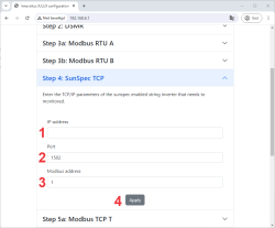 In de Jullix moet de omvormer communicatie nog geconfigureerd worden. Wanneer je een SMA string omvormer gebruikt via het netwerk, dan stel je in de SunSPec TCP configuratie bij IP-address (1) het IP-adres van de omvormer in. Bij Port (2) stel je de poort in die ingesteld is. Voor de SMA is dit standaard 502. Bij Modbus address (3) stel je 126 in voor de SMA omvormers.