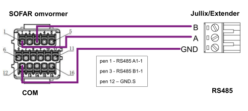 Bij de Jullix gebruik je de beschikbare RS485 poort, op onderstaand schema zie je hoe de aansluitingen moeten gebeuren. In de COM stekker pen 1 → A, pen 3 → B, pen 12 → GND.