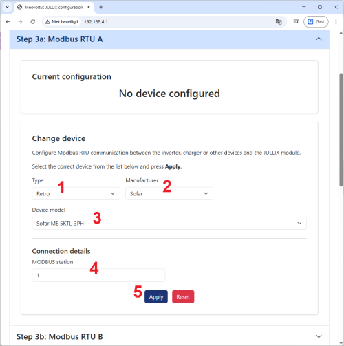 Wanneer je een SOFAR retrofit omvormer gebruikt, dan kies je in de modbus RTU configuratie bij Type: Retro (1) big Manufacturer kies je Sofar (2). Bij Device Model, bijvoorbeeld Sofar ME 5KTL-3PH (3) voor een driefase retro omvormer Sofar 5kW. Bij Connection details stel je bij MODBUS station (4) stel je het juiste modbus adres in; meestal is dit 1.