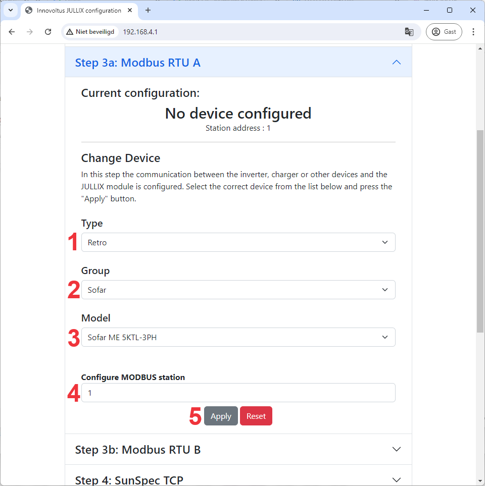 In de Jullix of Extender moet de omvormer communicatie nog geconfigureerd worden. Wanneer je een Sofar MEXXKTL-3PH retro omvormer gebruikt, dan kies je in de modbus RTU configuratie bij Type: Retro (1) in de Group kies je Sofar (2). Bij Model kies je vervolgens het juiste Model, bijvoorbeeld SOFAR ME 5KTL-3PH (3). In Configure modbus station stel je het juiste modbus adres in; meestal is dit 1 (4). Via Apply (5) worden de instellingen bewaard.