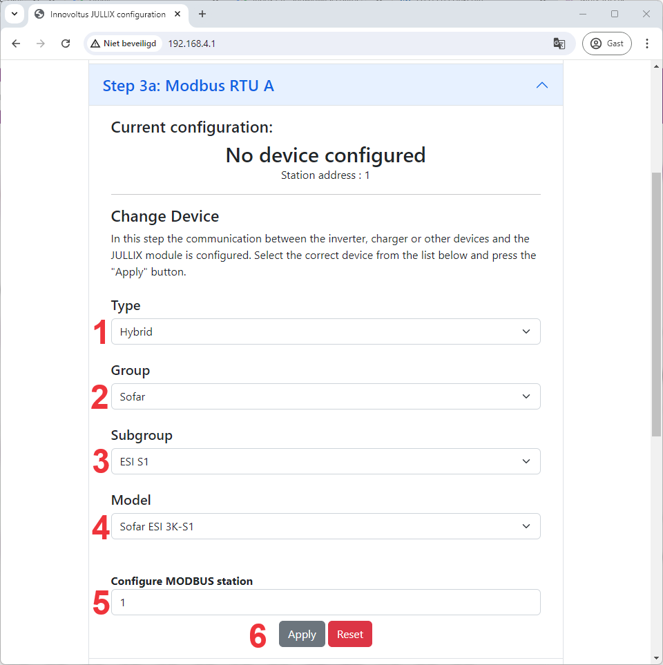 In de Jullix of Extender moet de omvormer communicatie nog geconfigureerd worden. Wanneer je een Sofar POWERALL hybride omvormer gebruikt, dan kies je in de modbus RTU configuratie bij Type: Hybrid (1) in de Group kies je Sofar (2). In de Subgroup kies je in dit geval ESI S1 (3) en vervolgens het juiste Model, bijvoorbeeld Sofar ESI 3K-S1 (4). In Configure modbus station stel je het juiste modbus adres in; meestal is dit 1 (5). Via Apply (6) worden de instellingen bewaard.