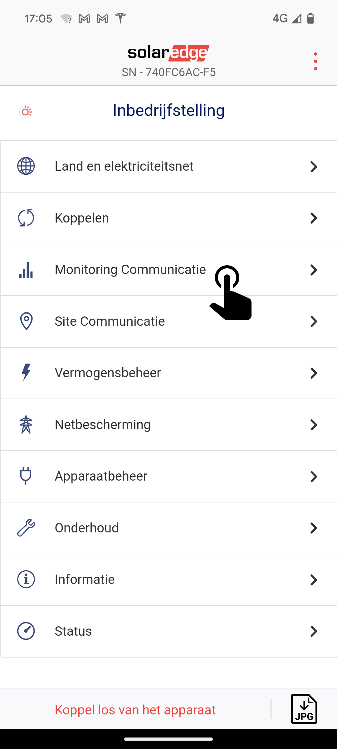 - In het Inbedrijfstelling-menu kies je Monitoring Communicatie