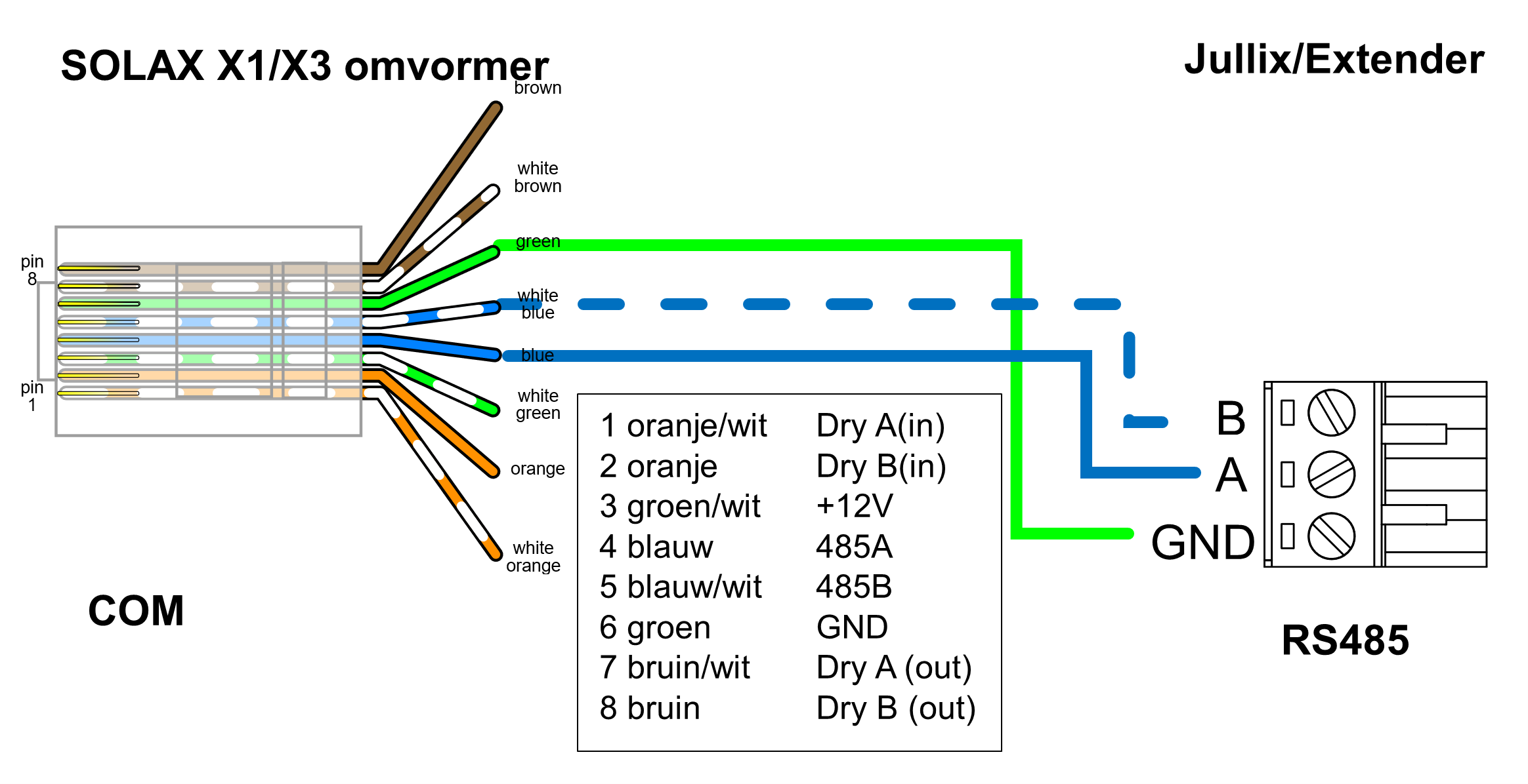 Op onderstaand schema zie je hoe de aansluitingen moeten gebeuren. Signaal Solax pen 6 GND→ G, pen 4 485A→ A en pen 5 485B→ B.