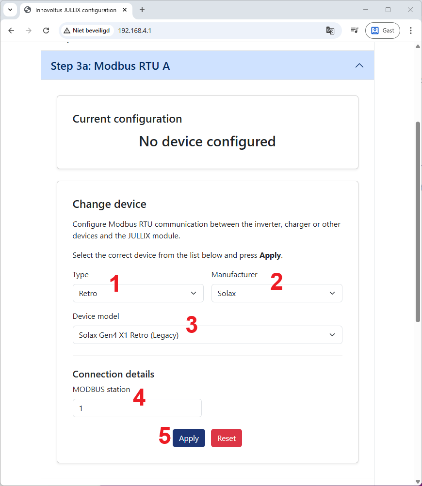 Wanneer je een Solax Gen4 X1 retro omvormer gebruikt, dan kies je in de modbus RTU configuratie bij Type: Retro (1), bij Manufacturer kies je Solax (2). Vervolgens kies je bij Device model, Solax Gen4 X1 Retro (Legacy)(3).