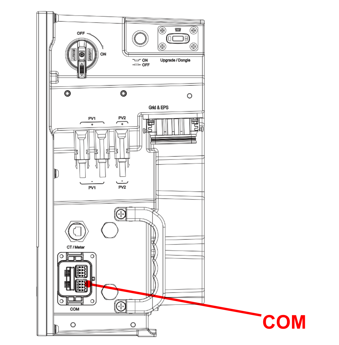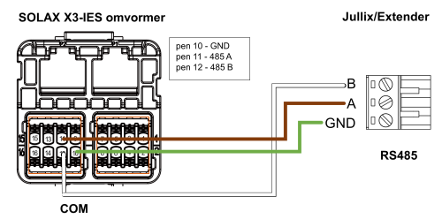 De Jullix of Extender wordt verbonden met de X3-IES via modbus/RS485 van de omvormer. Je vindt de RS485 aansluiting terug op de COM poort.
