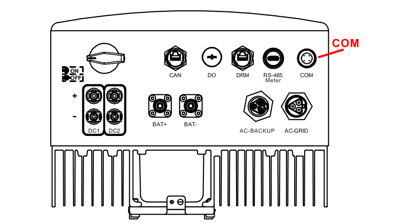 De Jullix of Extender wordt verbonden met de RHI(3-6)K-48ES-5G of S5-EH1P(3-6)K-L via modbus/RS485 van de omvormer. Je vindt de RS485 aansluiting terug op de COM poort.