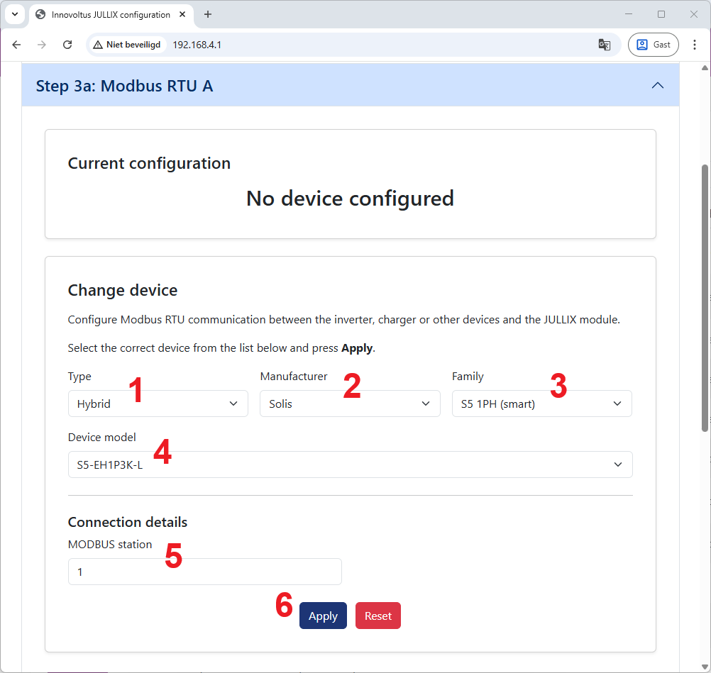 In de Jullix of Extender moet de omvormer communicatie nog geconfigureerd worden. Wanneer je een SOLIS hybride omvormer gebruikt, dan kies je in de modbus RTU configuratie bij Type: Hybrid (1) in de Manufacturer kies je Solis (2). Bij Family kies je in dit geval S5 1PH (Smart)(3) en vervolgens het juiste model bijvoorbeeld voor de Solis S5-EH1P3K-L (Smart) kies je: S5-EH1P3K-L (4).