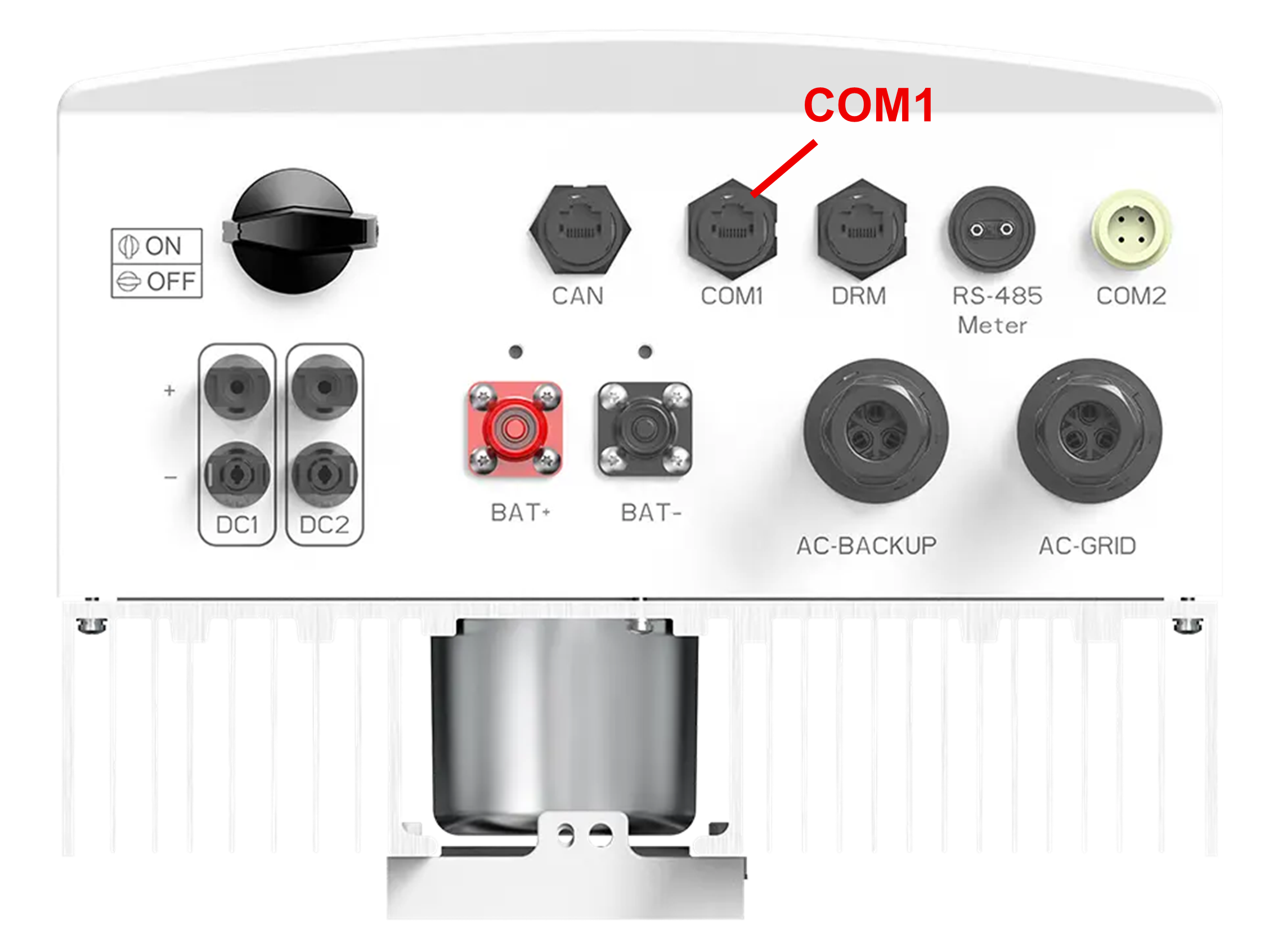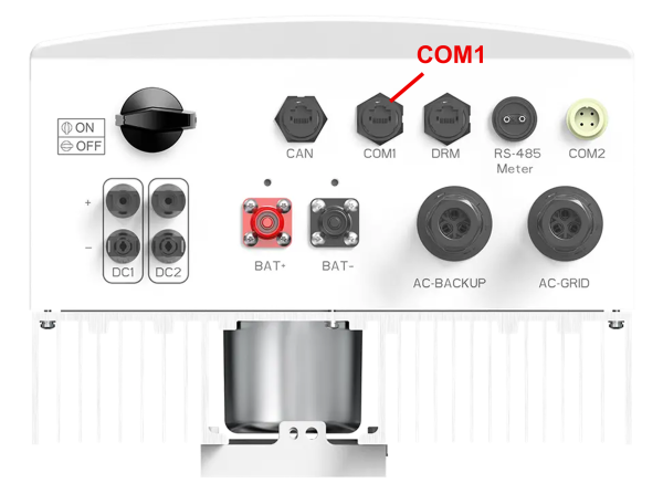 De Jullix of Extender wordt verbonden met de S5-EH1P(3-6)K-L(Smart) via modbus/RS485 van de omvormer. Je vindt de RS485 aansluiting terug op de COM1 poort.