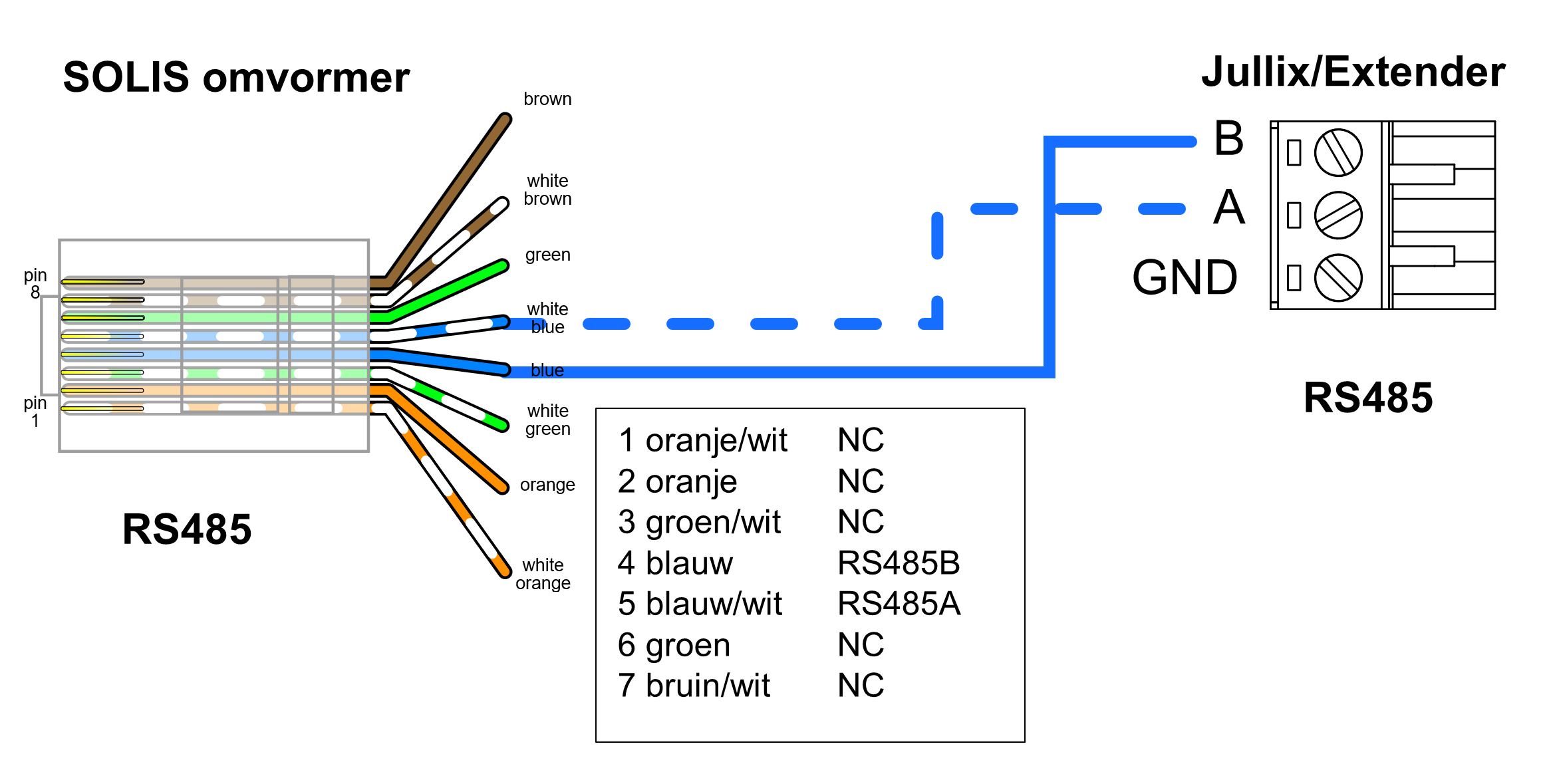 Op onderstaand schema zie je hoe de aansluitingen moeten gebeuren. Signaal Solis RJ45: pen 4 (blauw) → B en pen 5 (blauw/wit) → A.