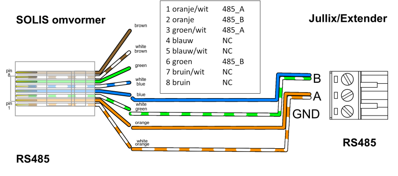 Op onderstaand schema zie je hoe de aansluitingen moeten gebeuren. Signaal Solis RJ45: pen 1 of 2 (oranje/wit of oranje) → A en pen 3 of 4 (groen/wit of blauw) → B.