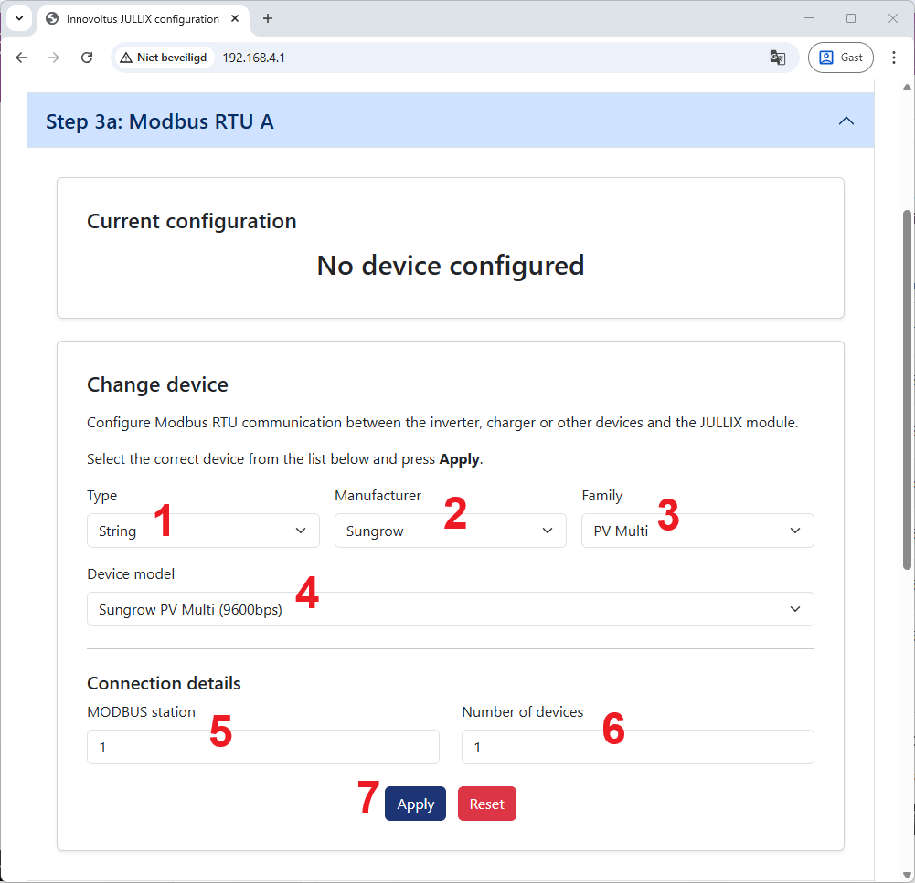 Bij Connection details stel je bij MODBUS station (5) het juiste modbus adres in; meestal is dit 1 (5). Vervolgens geef je het aantal omvormers in bij Number of devices (6).