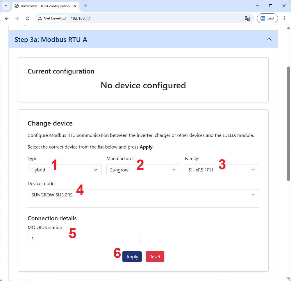 In de Jullix of Extender moet de omvormer communicatie nog geconfigureerd worden.