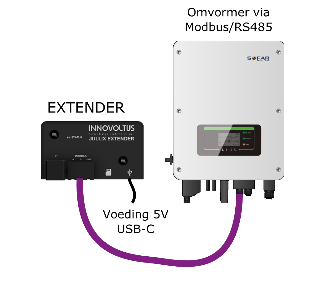 Als enkel de omvormer via de Extender wordt verbonden, moet je de extender ook nog voeden. Soms kan dat via een extra verbinding via de omvormer. Als dat niet kan dien je een voeding 5V USB-C te gebruiken.