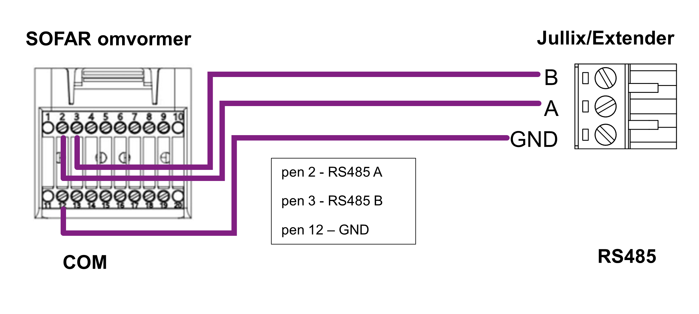 Bij de Jullix gebruik je de beschikbare RS485 poort, op onderstaand schema zie je hoe de aansluitingen moeten gebeuren. In de COM stekker pen 2 → A, pen 3 → B, pen 12 → GND.