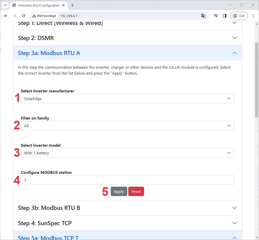In de configuratie pagina van de Jullix kies je Step 3a: Modbus RTU A als je de kabel hebt aangesloten op de RS485A connector van de Jullix. Je kiest Step 3b: Modbus RTU B als je de kabel hebt aangesloten op de RS485B connector van de Jullix. Als je de kabel hebt aangesloten aan de Extender dan kies je in de configuratie pagina van de Extender Step 3: Inverter.