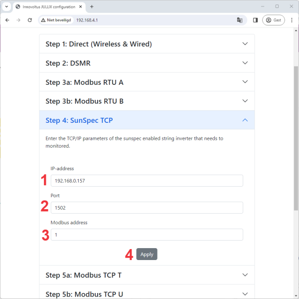 In de configuratie pagina van de Jullix kies je Step 4: SunSpec TCP. Bij IP-address (1) stel je het IP-adres van de omvormer in. Bij Port (2) stel je de poort in die ingesteld is. Voor de SolarEdge is dit standaard 1502. Bij Modbus address (3) stel je 1 in voor de SolarEdge omvormers.