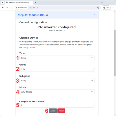 Wanneer je een SOFAR string omvormer gebruikt, dan kies je in de modbus RTU configuratie bij Type: String (1) in de Group kies je Sofar (2). In de Subgroup kies je in dit geval opnieuw String (3) en vervolgens het juiste model, bijvoorbeeld Sofar 1100TL (4). In Configure modbus station stel je het juiste modbus adres in; meestal is dit 1 (5). Via Apply (6) worden de instellingen bewaard.