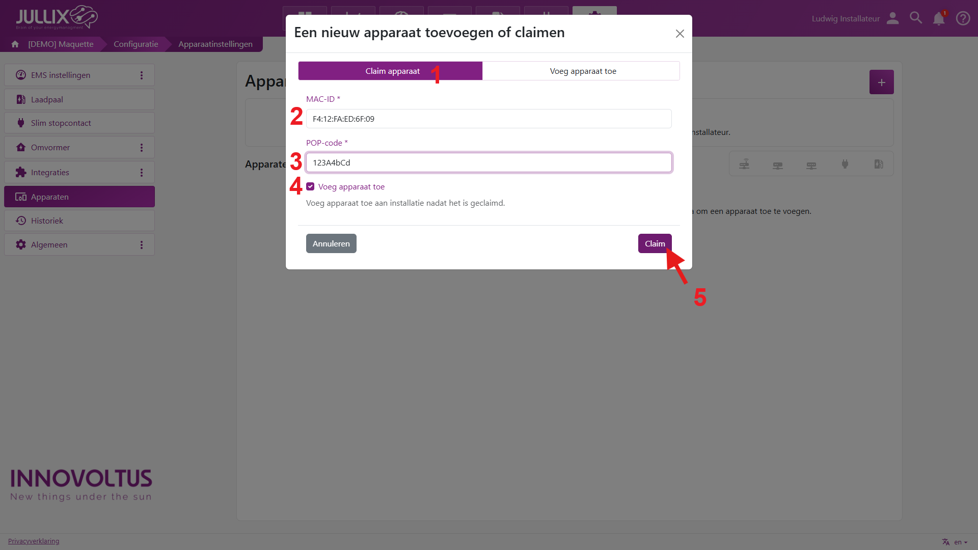 Met een druk op de Claim (5) worden MAC en POP gecontroleerd en als die overeenkomen wordt het apparaat toegevoegd.