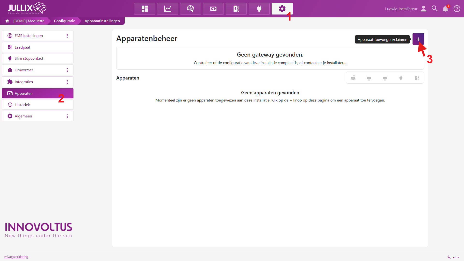 Apparaten die fysiek geïnstalleerd zijn moeten ook toegevoegd worden aan de installatie op het portaal zodat de gemonitorde data van het apparaat bij de installatie bewaard wordt. In eerste instantie is dat de Jullix, maar ook de andere apparaten (Extender, Nuo, Muon, …) moeten toegevoegd worden. Dit is altijd volgens dezelfde procedure.
