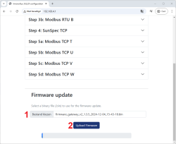 Als je de firmware gedownload hebt op je smartphone kan je wanneer je verbinding hebt gemaakt met de Jullix de firmware uploaden naar de Jullix. Onderaan de config pagina vindt je de Firmware update dialoog. Je klikt op de knop Bestand kiezen (1) om het bestand op je smartphone of laptop te kiezen. Vervolgens klik je op Upload Firmware (2) om de firmware te updaten.