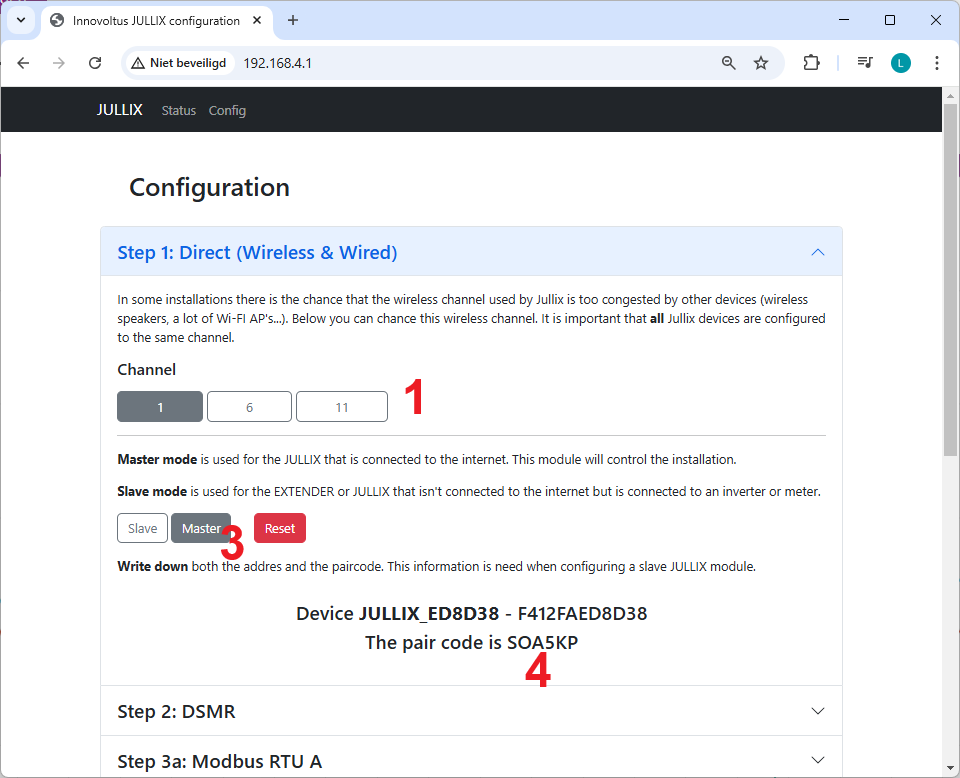 Je kan dan de gevonden Jullix Master, wired of wireless selecteren (2) en de paircode ingegeven (3). Je maakt de verbinding met Pair device (4). Als de paircode geldig is, zal de Jullix Slave gekoppeld worden aan de Jullix Master. Je ziet dit op de statuspagina van Jullix.