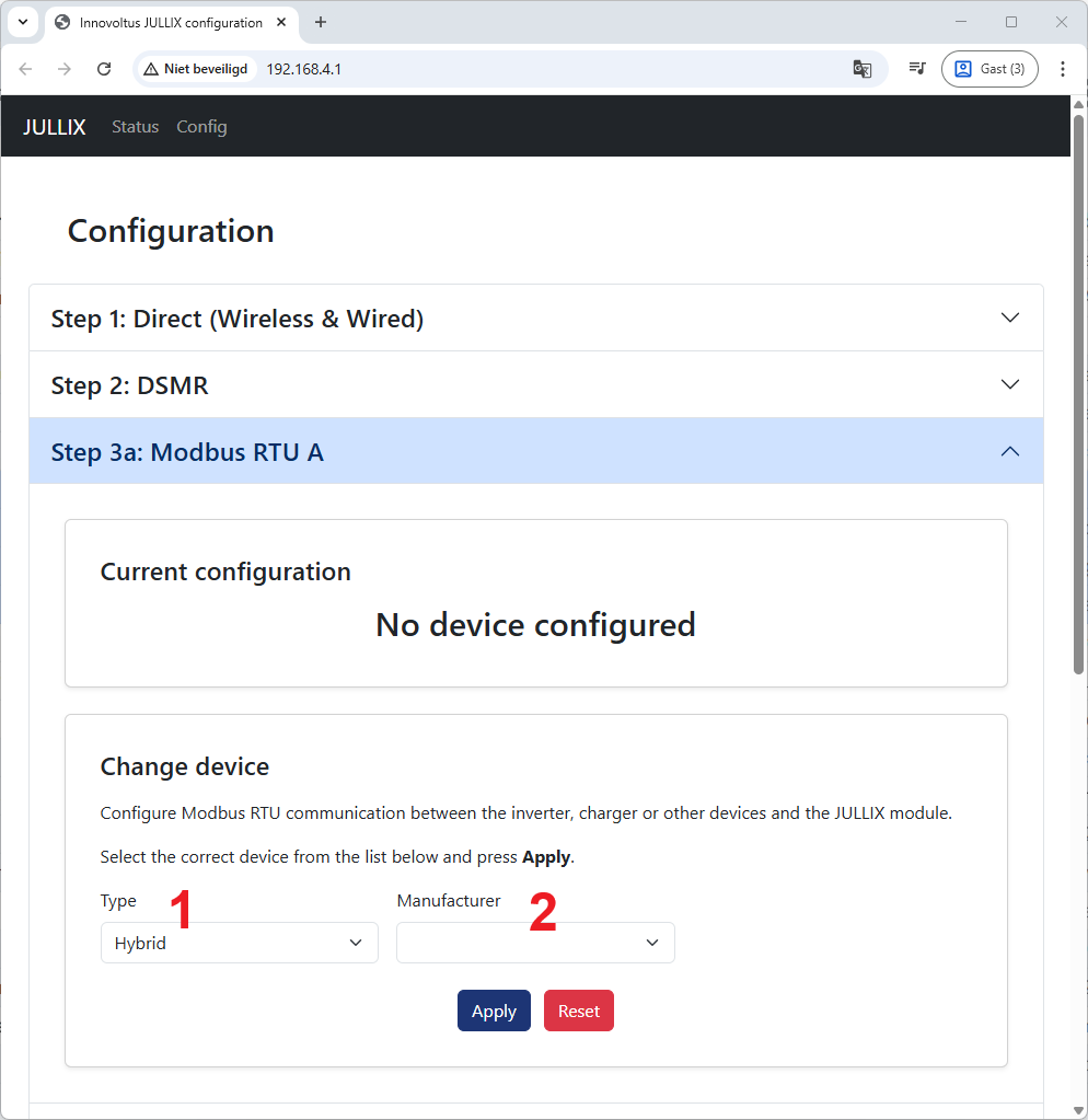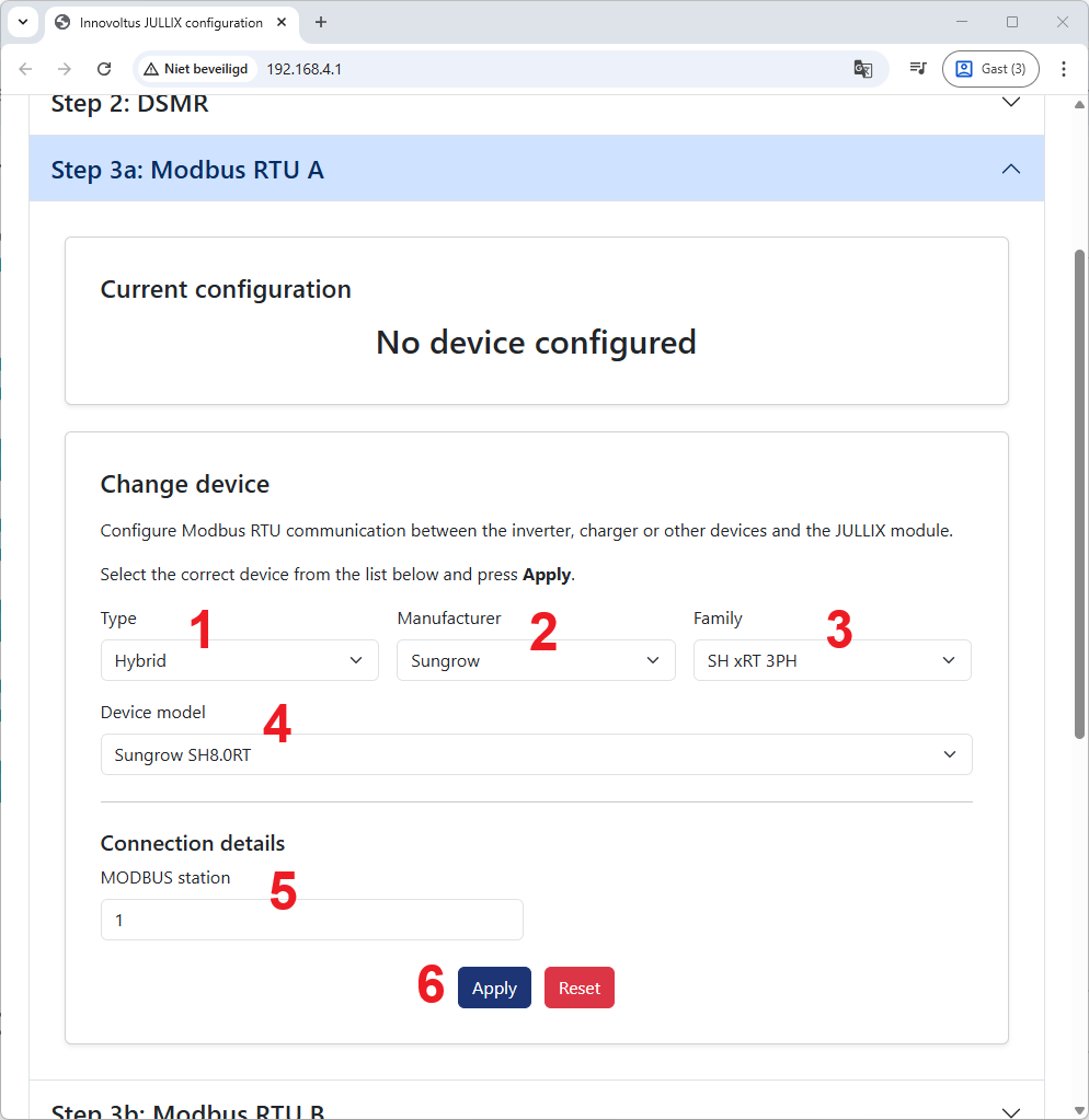 Bij Step 3a: Modbus RTU A stel je in welk apparaat je hebt aangesloten op RS485A van jouw Jullix.