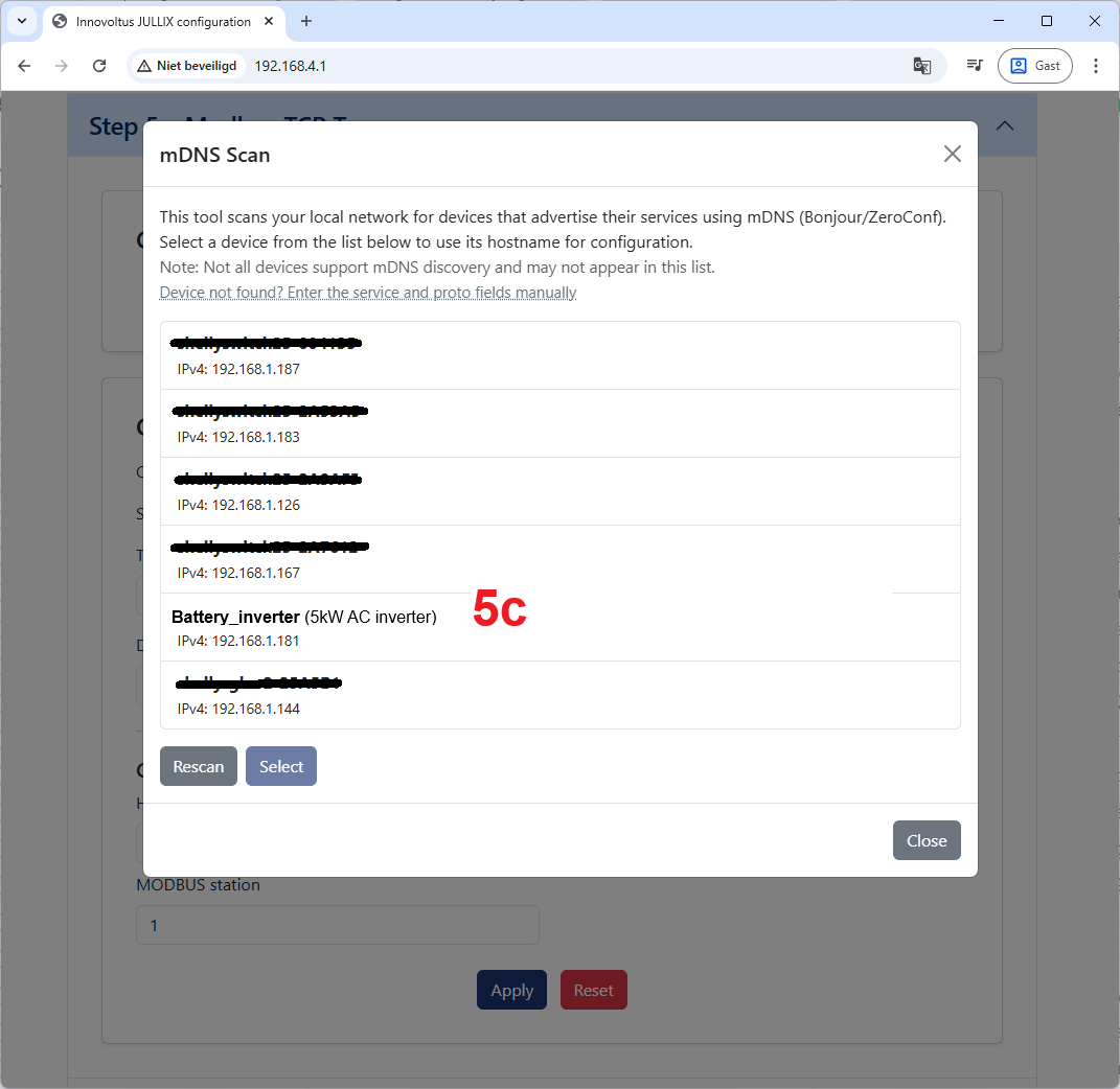 Bij Connection details geef je bij Hostname / IP (5) de hostname of het IP-adres van de omvormer in. Als de omvormer dit ondersteund geef je bij voorkeur de Hostname in. Via Scan (5b) kan je het netwerk scannen naar de omvormer als je de hostname niet kent. In het lijstje van gedetecteerde apparaten kies je dan de omvormer (5c).