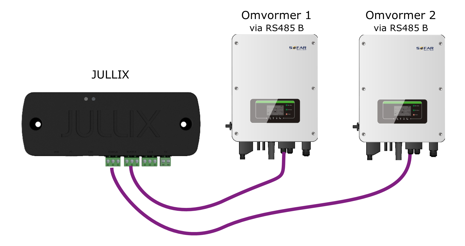 Een ondersteund modbus apparaat, bijvoorbeeld een omvormer, kan via één van de twee RS485/Modbus-stekkers met jullix verbonden worden. De RS485-kabel van het apparaat wordt aangesloten aan de meegeleverde schroefplug. Zowel de 2 signaaldraden A en B, als de GND worden aangesloten. Indien er geen kabel voorzien is, raden we aan om een modbus-kabel te gebruiken, bijvoorbeeld: UNITRONIC® BUS LD 1x2x0,22.