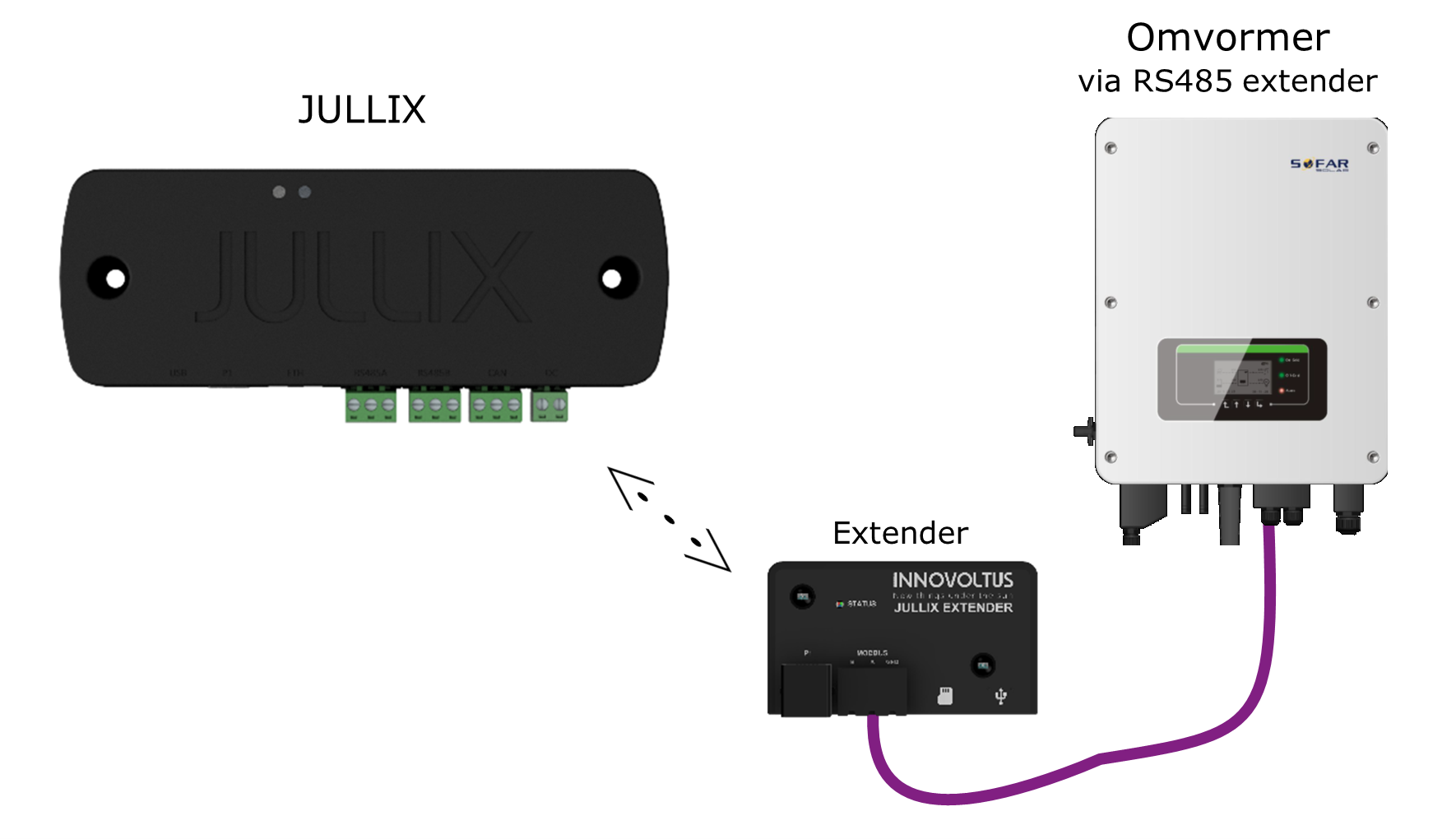 Als de omvormer niet rechtstreeks gekoppeld kan worden, dan kan dit via een Extender.