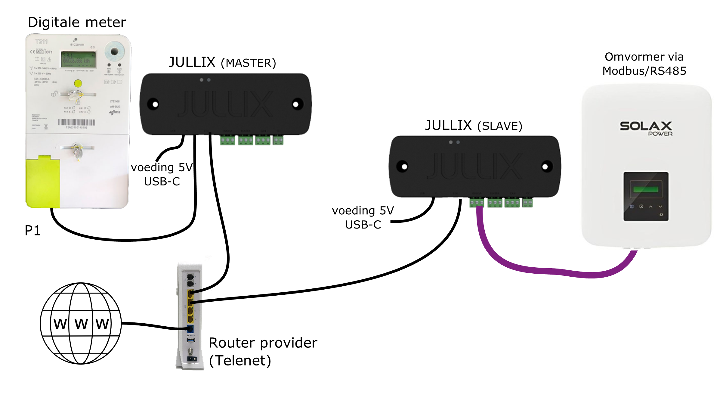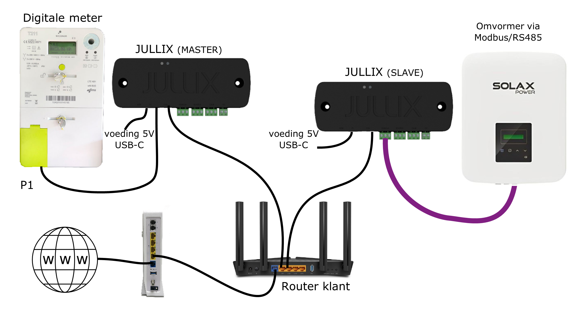 Als Jullix, de digitale meter, de omvormers en eventuele extenders zijn aangesloten, kan Jullix geconfigureerd worden.