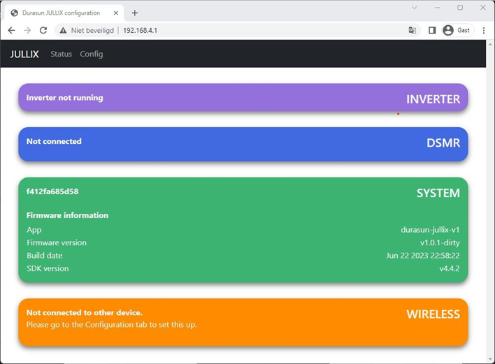 Je krijgt de statuspagina van de Jullix Lite waar je de toestand kan bekijken. Je vindt hier ook de firmware versie enz.