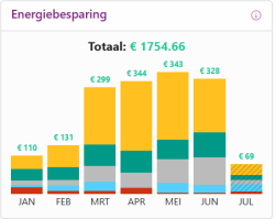 Op het dashboard zie je de besparingen van de afgelopen zes maanden, plus de lopende maand. Deze laatste wordt gearceerd weergegeven, omdat de maand nog niet is afgelopen en de besparing dus nog niet volledig is.
