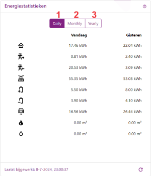 Bij het energiestatistieken op het dashboard zie je de totalen van de energie van je installatie. Je kan dat per item snel vergelijke met de vorige waarde. Je kan vergelijken per dag 1, per maand 2 of per jaar 3.