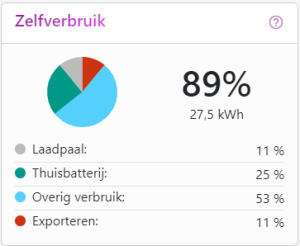 Bij 'zelfverbruik' zie je waar de energie die vandaag is opgewekt, wordt gebruikt. Het aandeel van de opgewekte energie dat je zelf gebruikt, zie je in het blauw. Heb je een thuisbatterij, dan zie je in het groen het aandeel van de opgewekte energie dat in de thuisbatterij is gestopt. Als je een geconnecteerde laadpaal hebt, dan krijg je in het grijs het aandeel van de opgewekte energie dat je in de auto hebt gestopt. Het aandeel in het rood is het deel van de opgewekte energie dat geëxporteerd is naar het net. De energie die je gebruikt hebt + de energie die je in de thuisbatterij hebt gestopt + de energie die je in de auto hebt gestopt is de energie die je zelf hebt gebruikt. Het percentage is een indicatie van hoeveel van de energie je effectief zelf hebt gebruikt op het totaal van de opgewekte energie, en dus niet hebt geëxporteerd naar het net.