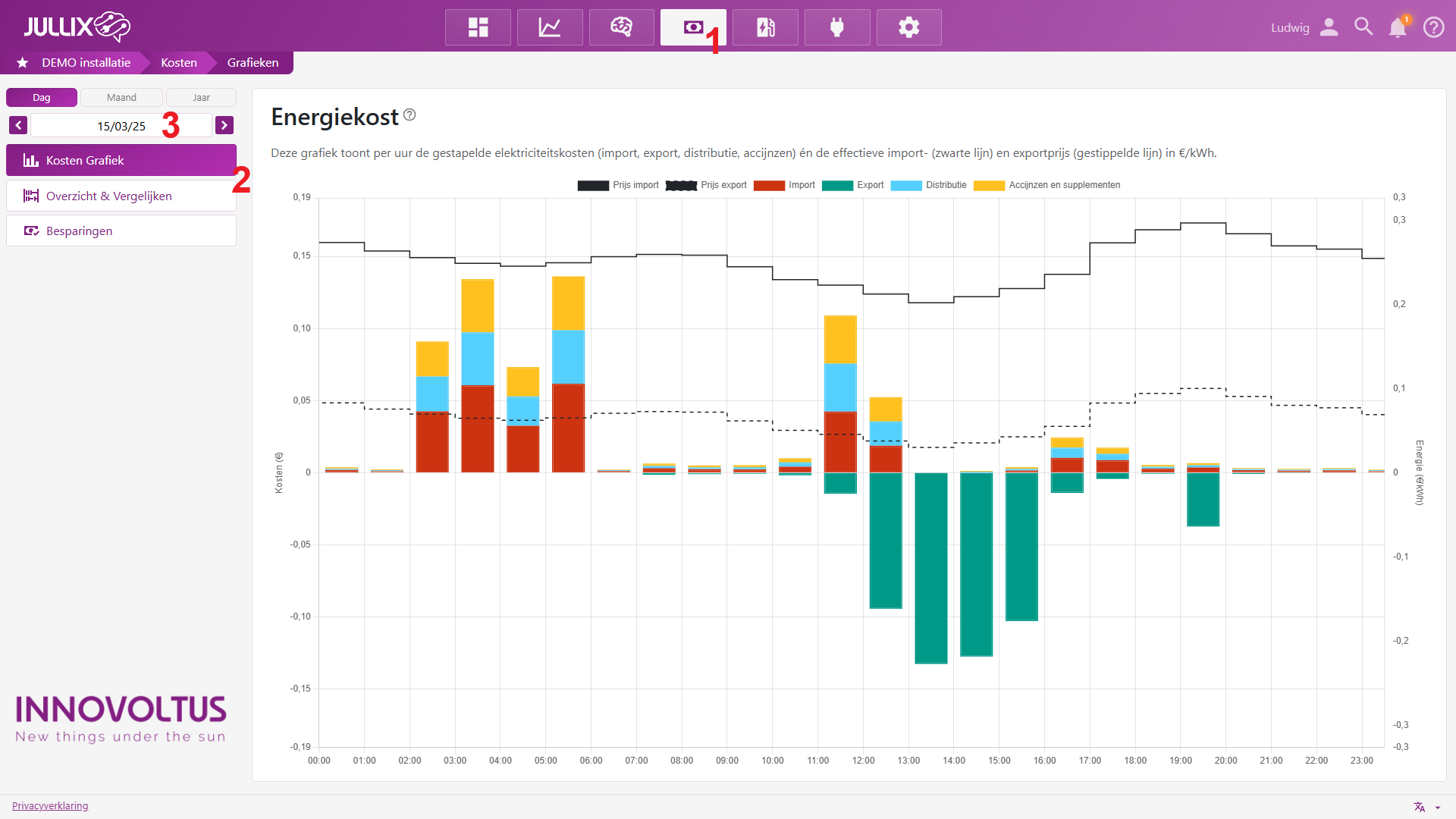 Via Energiekost 1in de menu-balk, kan je bekijken wat de kosten en de besparingen zijn van je installatie.