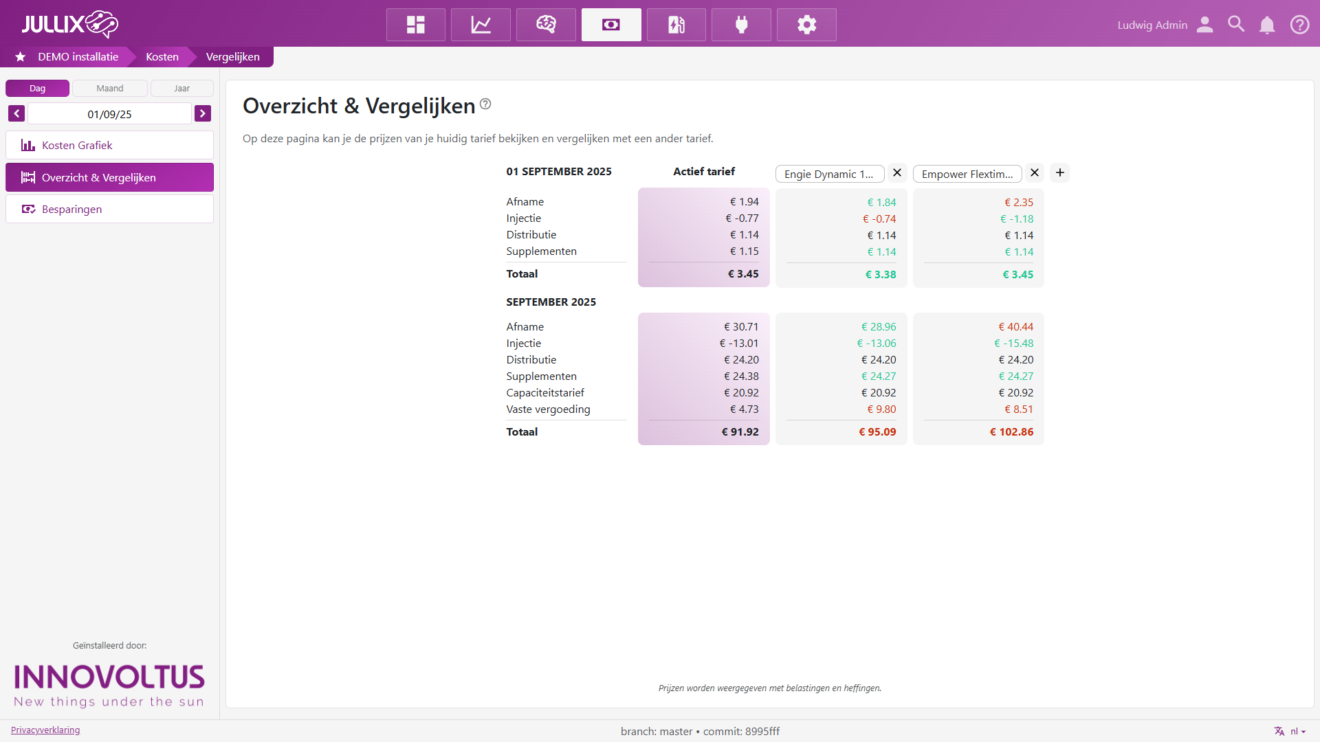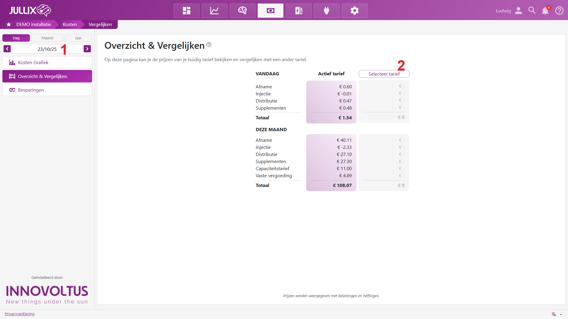 Bij Overzicht & vergelijken krijg je een berekening van de kosten die je op je energie factuur zou moeten terug vinden. Je ziet de kost voor de gekozen dag. En daaronder de kost van de maand, als je per maand gefactureerd wordt zou die dus moeten overeenkomen. Je kan in de kalender 1 de dag en de periode kiezen.