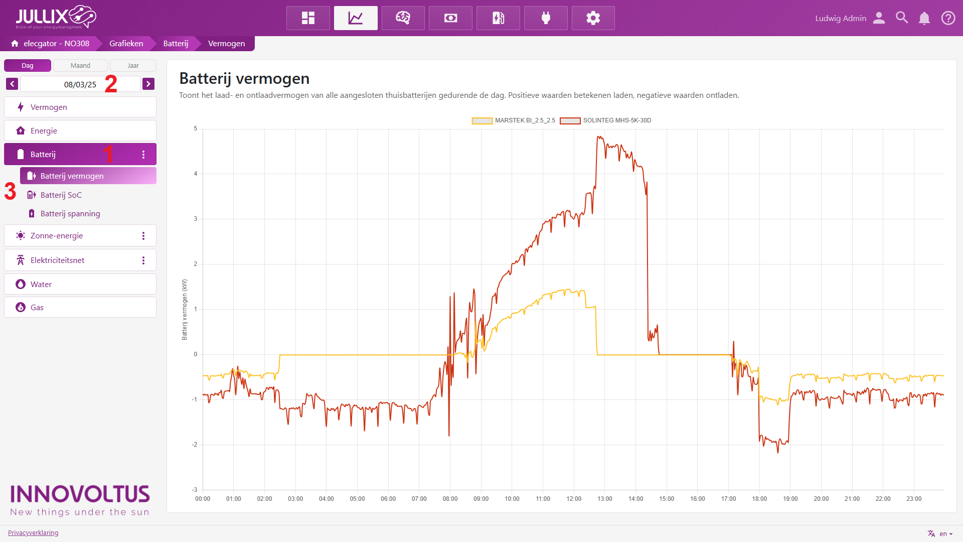 Onder Batterij vind je verschillende grafieken (3) van het batterijsysteem. Als er meerdere batterijsystemen in de installatie zijn, dan zie je dit van elk batterijsysteem apart in de grafiek.
