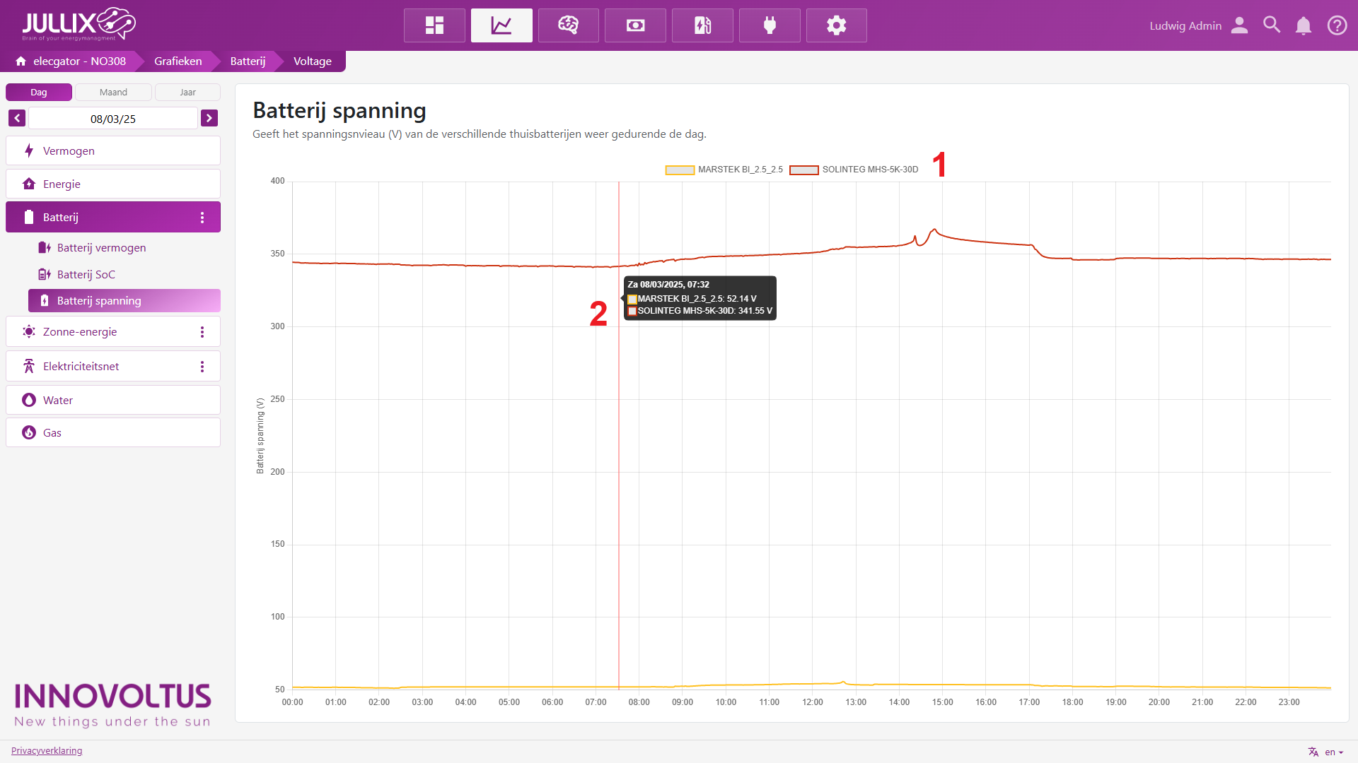 In de grafiek van de Batterij spanning worden de spanningen (V) van de aangesloten hybride en retrofit-omvormers weergegeven. Elke batterij-omvormers krijgt een andere kleur. Door te klikken op de legende (1) kan je een omvormergrafiek verbergen of tonen. In het voorbeeld heeft de hybride omvormer van Solintec een hoogspanningsbatterij aangesloten en zie je een Marstek laagspanningsbatterij.